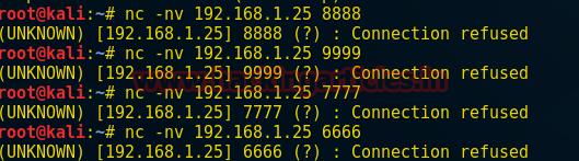 nc –nv 192.168.1.25 8888 nc –nv 192.168.1.25 9999 nc –nv 192.168.1.25 7777 nc –nv 192.168.1.25 6666