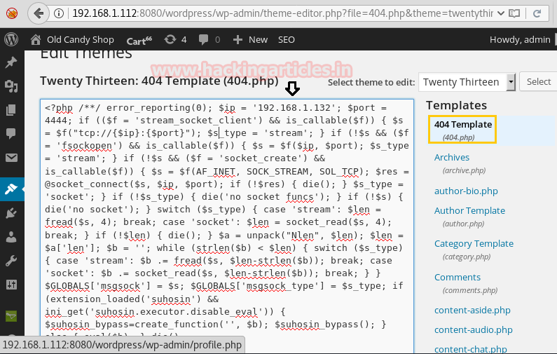 From generated php raw file copy the code from <?php to die(). As we want to read a file on the system, let’s put some PHP code in the theme: We go to Appearance -> themes -> 404.php and add some PHP code in order to execute it.
