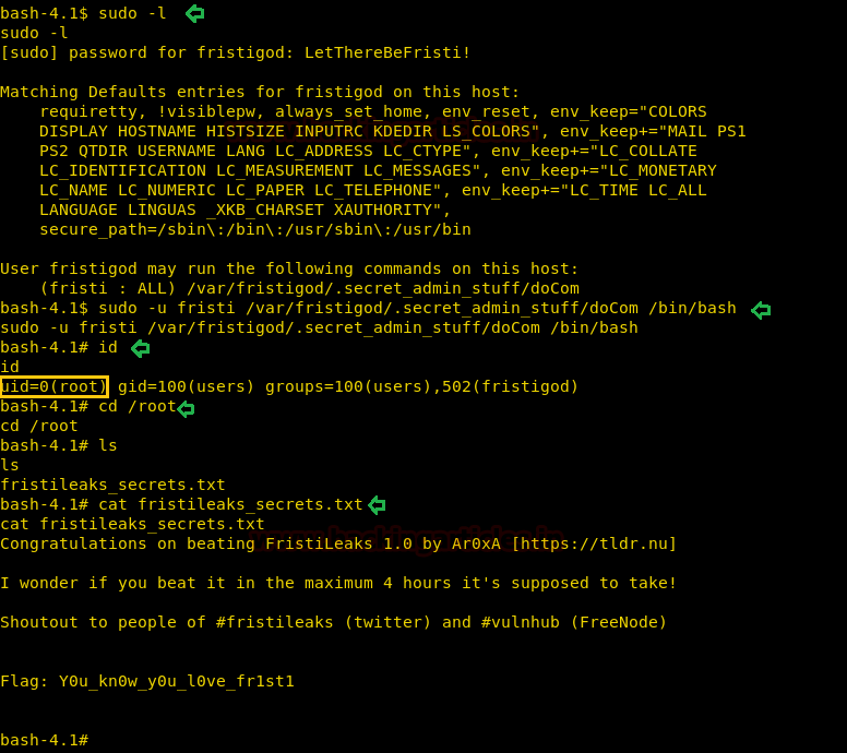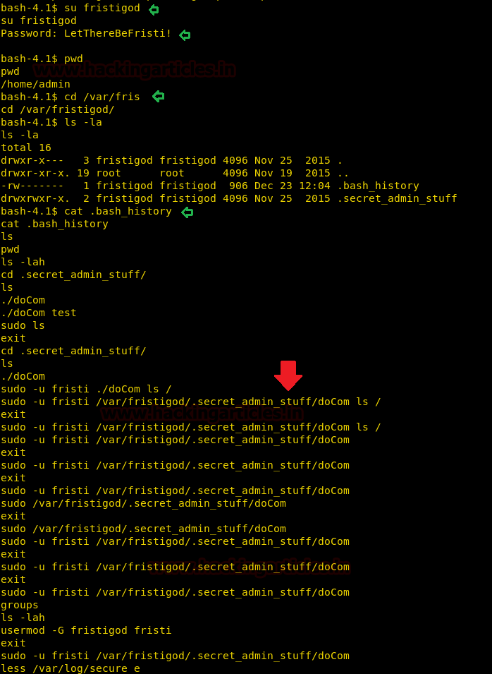 Enter ‘LetThereBeFristi’ as a password. Then I explored the fristigod folder and there I found the history file. In this history file, there was one command that was used over and over again with sudo permissions: