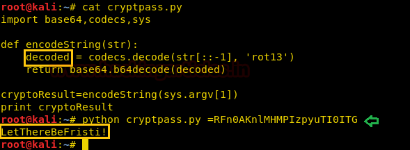 Now, in the above image, you can see that it said that the code allows the string to be encrypted so now, save the script in your kali and then change the word ‘base64string’ to ‘decoded’ in the script and finally use the following command to decrypt it :