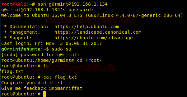 When we get root access we go to root folder inside the root folder we get a file called flag.txt. when we open the file we get a congratulatory message for the completion of VM.