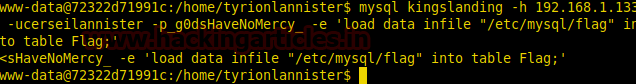 On the webpage earlier we find hex encoded string when we decode it we get a location of a file:/home/tyrionlannister/checkpoint.txt, so we open it and find username, password and name of the database we need to look for.