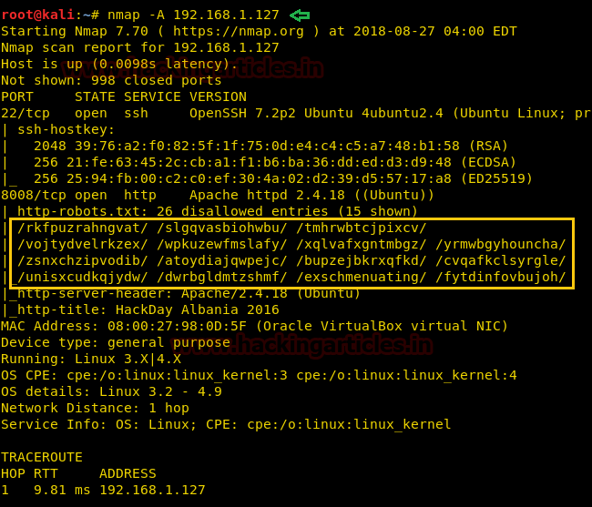 Here you can observe that port 22 and 8008 are opened, also you can observe there is a robot.txt file in which 15 entries are allowed and 26 are disallowed.