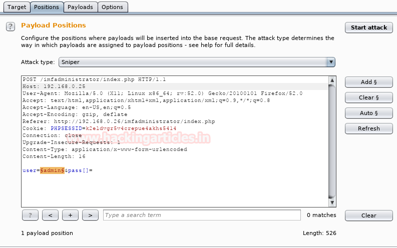 We use burpsuite to launch a dictionary attack. We select the position and change the password from string to array.