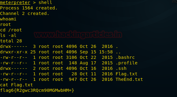 Now we take shell check our privileges, we find that we are root. When we move inside the /root/ folder we find our 6th and final flag.