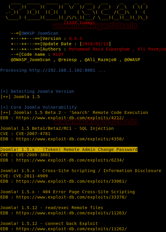 Applying the joomscan will show all the vulnerable exploits. Here we can observe the highlighted text pointing towards “Admin Password changed” seems to be vulnerable against exploit 6234. Now if you look closely the exploit number 6234 will show you the steps to exploit the certain vulnerability.