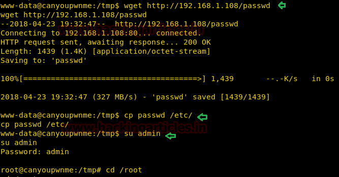 But the task is not completed yet, this boot to root challenge and still, we are lacking root privilege. Now open the password file with help of cat where you will find an entry for admin. Now we know the admin user’s password and by manipulating his entries, we can increase his privileges and do so copy the whole content of this file.