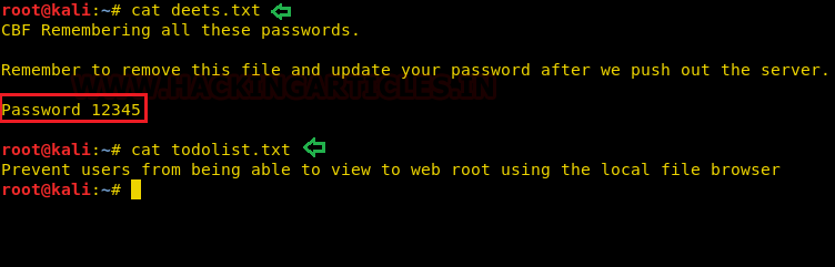 Looking into ‘deets.txt’ we get a password:12345. Great! But as of now, we are not sure this password could belong to a user or root.