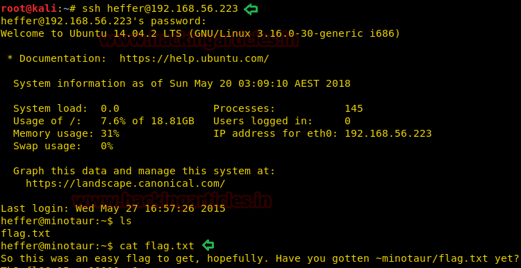 We found the passwords for both heffer and minotaur. Please recall that port number 22 i.e. for ssh was open and we can use it to log in and for this type: