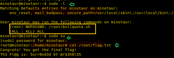 Now, we have finally found the first flag along with another hint that is the final flag is in /root/flag.txt now let check sudo right for user Minotaur.