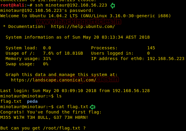 Now in the flag, we found another flag along with a hint indicating that the flag is Minotaur. Now we will log in through SSH using minotaur: