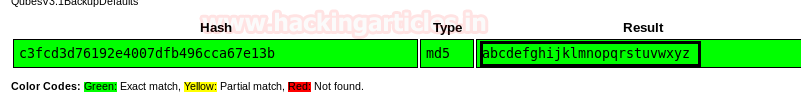 We will use md5 online decrypting tool for cracking this MD5 value. Enter the MD5 value into the hash box and obtain the result. The value will translate to abcdefghijklmnopqrstuvwxyz as shown below.