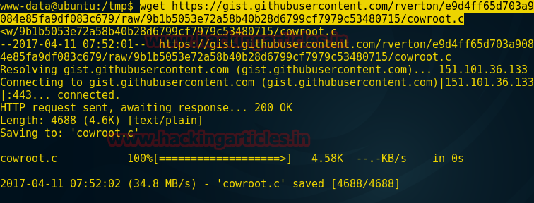 Now use “Dirty cow exploit” therefore type the following command to download this exploit inside tmp folder of the victim.