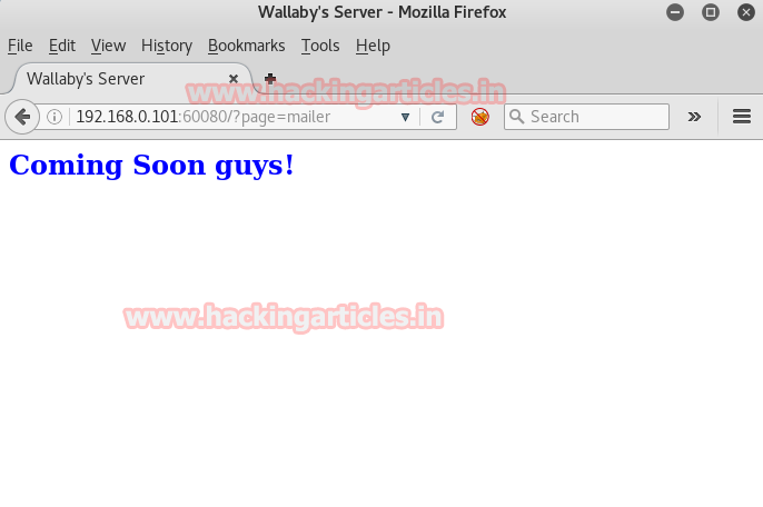 So when I browse 192.168.0.101:60080/?page=mailer in URL the resultant web page gets opened and I found nothing special here except “coming soon, guys!”