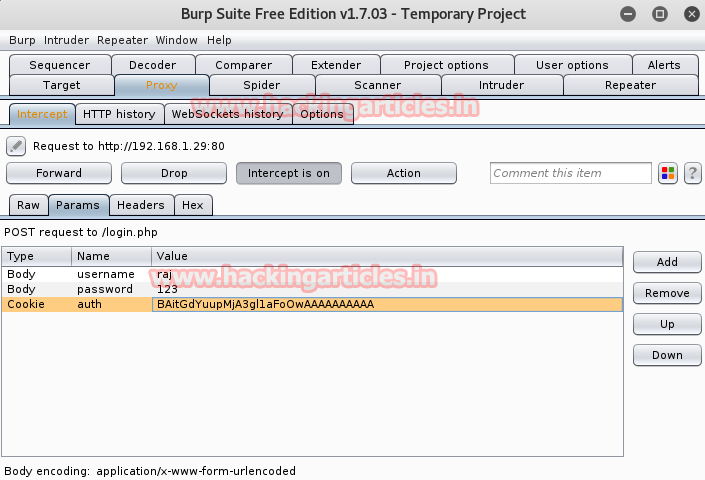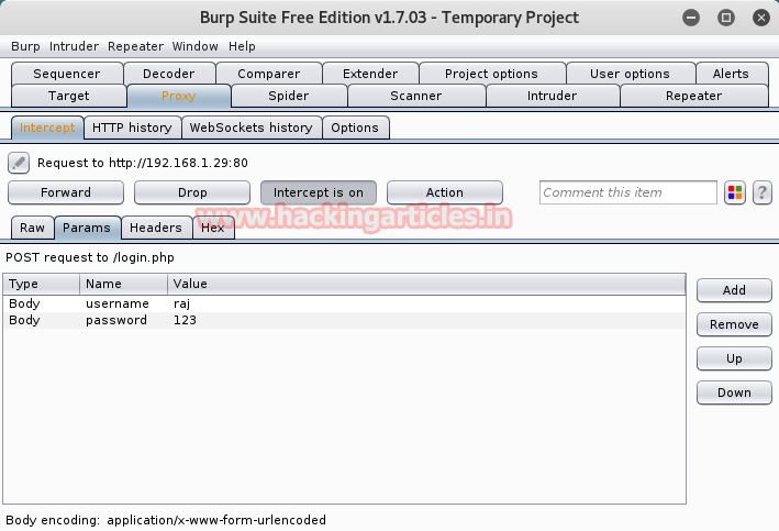 Turn up burp suite and don’t forget to set manual proxy of your browser. Now open proxy tab and hit intercepts on the button to capture the request of the target. When this is done you will get fetched data under intercept window. Here you will find that I try to login with credential raj: 123