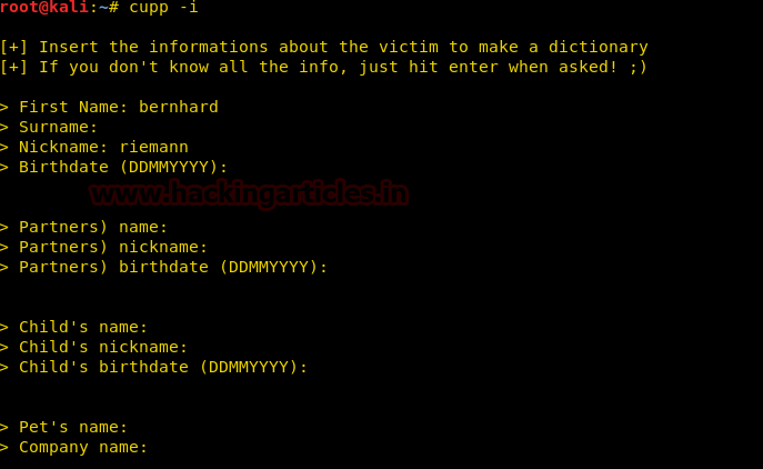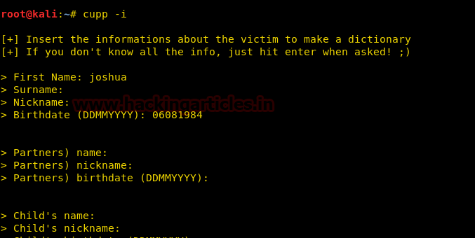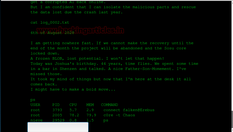 When we run connect falken@Erebus It prompts for password. We get a hint from the log files that the password might be related to Joshua. In the logs we find that his date of birth i 6th august 1984. We use cupp to create a dictionary file.