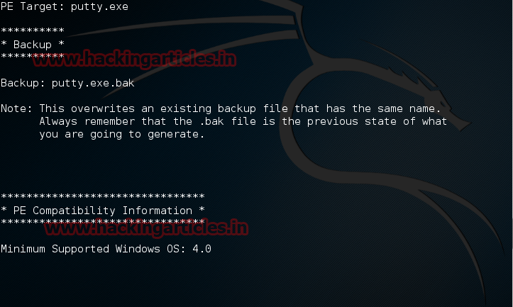 Now it asks for PE target after choosing operation method, give the filename .exe and binding process will start.