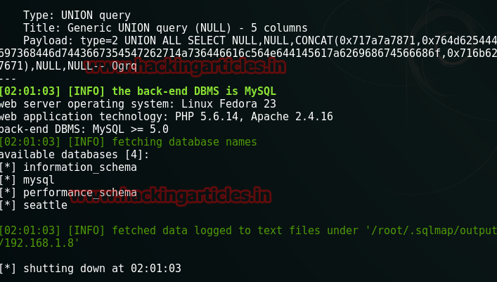 Then start the SQL attack by typing the following command in the terminal of Kali.