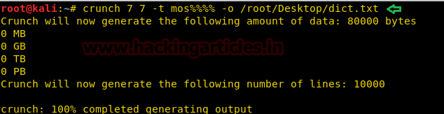 crunch 7 7 -t mos%%%% -o /root/Desktop/dict.txt