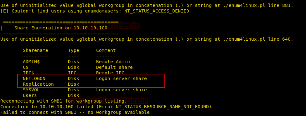 I try eternal blue attack when I saw port 445 was open but I guess this was Patched version of SMB, therefore I have to start with enum4linux script. As we all know it is the best script for SMB enumeration.
