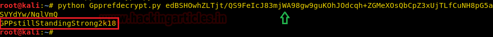 Therefore I download a python script “Gpprefdecrypt” from GitHub to decrypt the password of local users added via Windows 2008 Group Policy Preferences (GPP) and obtain the password: GPPstillStandingStrong2k18.