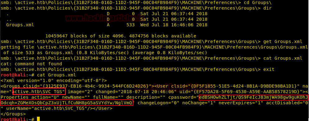 \active.htb\Policies\{31B2F340–016D-11D2–945F-00C04FB984F9}\MACHINE\Preferences\Groups\