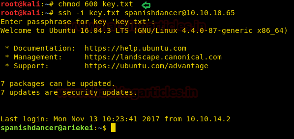 chmod 600 key.txt ssh -i key.txt spanishdancer@10.10.10.65