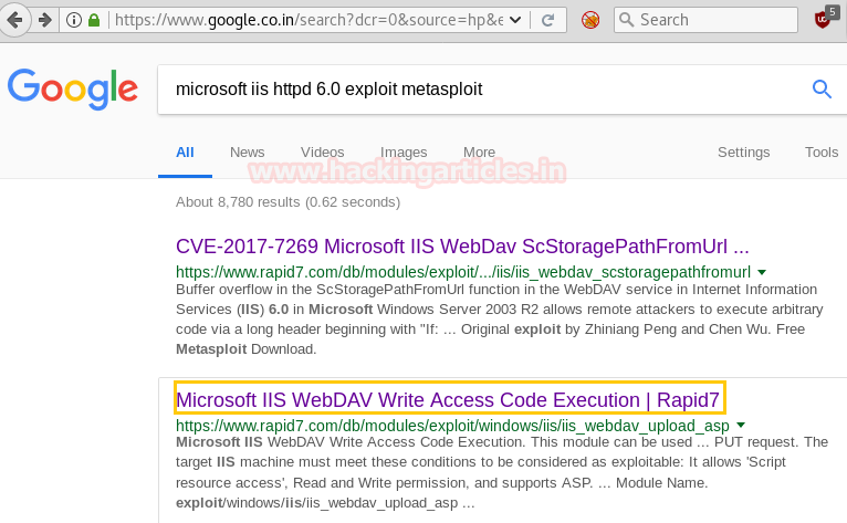 Since we know Microsoft IIS httpd 6.0 is running in victims system therefore when I Google I found Rapid 7 exploit for this as highlighted in given below image.