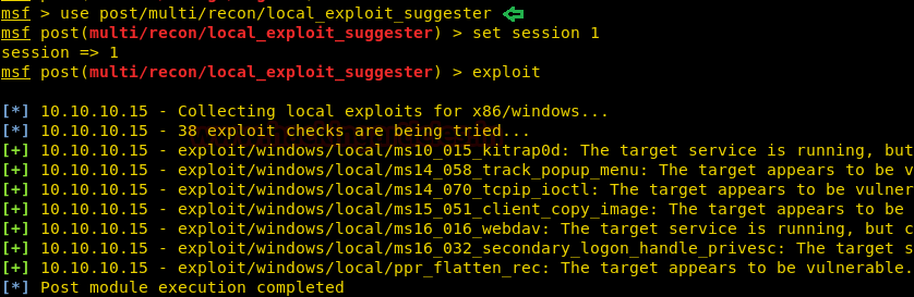 use post/multi/recon/local_exploit_suggester msf post(multi/recon/local_exploit_suggester) > set session 1 msf post(multi/recon/local_exploit_suggester) > exploit