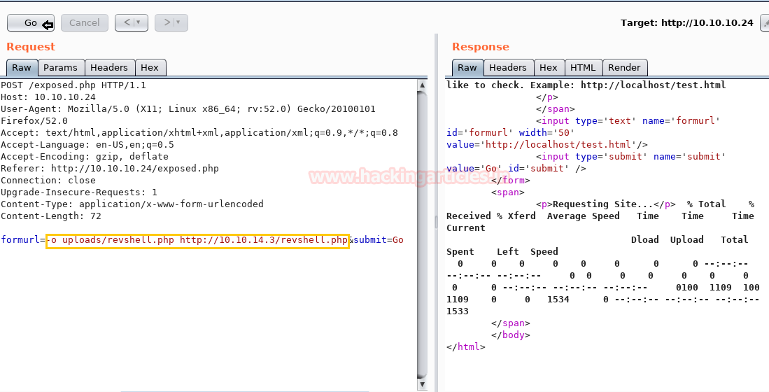 First I tried to upload the file directly through browser http://10.10.10.24/exposed.php but got failed at that point I use burpsuite for fetching HTTP post request and send it to the repeater. Then I run curl command for downloading any file from the given path by omitting word “curl” as shown below.