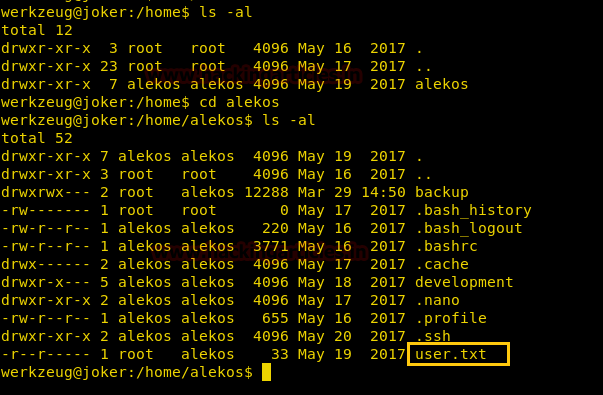 Now we use the private key we generated to login through ssh to the target machine. As soon as we login through ssh we find user.txt in the home directory of alekos we open it and find the first flag.